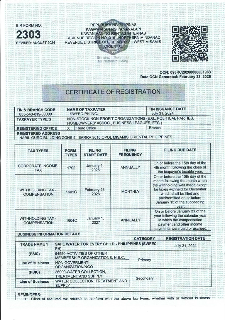 SWFEC-Ph, Inc. is a non-profit organization registered with the Philippine Securities and Exchange Commission (SEC Reg. No. 2024070157642-00). All funds are used exclusively for our water access programs.